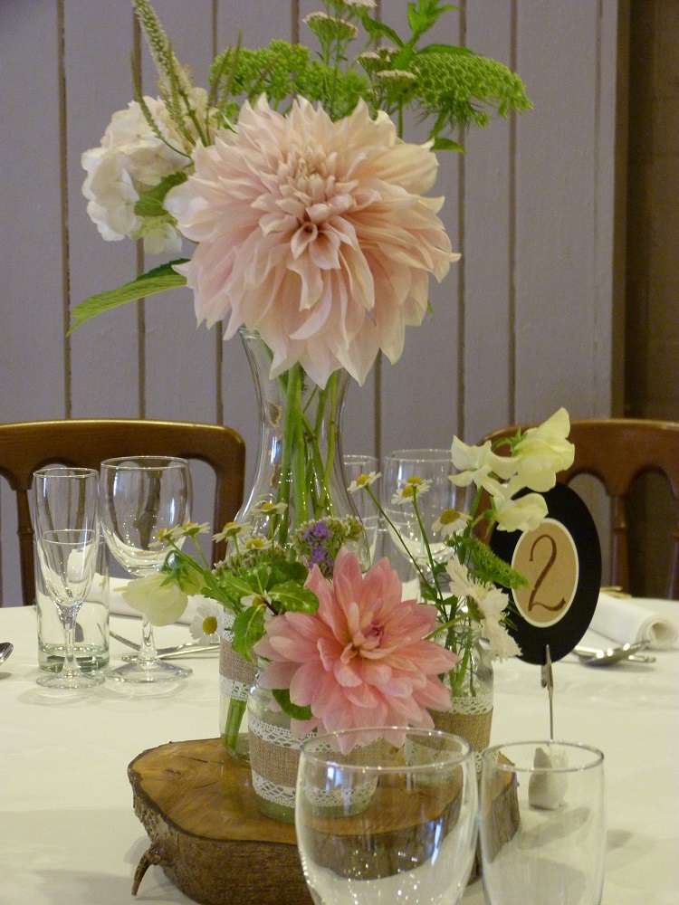 Sam and Ben collected a lovely mix of bottles, jars, jugs and bird cages, for us to fill with seasonal flowers in whites, greens and light pinks. These adorned the Barn tables, dresser and window ledges. The two jugs were placed on the Ceremony table.